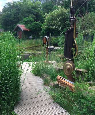 "Instrumente, die bespielt werden sollten. Der Wunsch nach einer Skulptur.  Im spielerischen Versuch entstanden wundervolle Kompositionen – wie von einer anderen Welt. Sie stehen herum – und klingen - und laden zum Bespielen ein: allein, zu zweit, zu dritt, mit den Händen, mit einem Bogen, mit verschiedenen Schlägeln..vielfältige Klänge, die die Skulpturen lebendig werden lassen und ihre Identität" musikalisch erweitern.